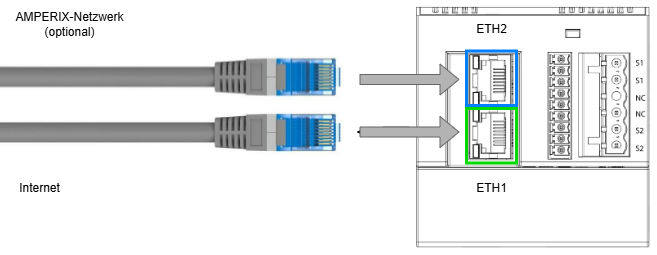 Wenn Sie Ihre Geräte in einem separaten Netzwerk verwalten möchten (AMPERIX®-Netzwerk), verbinden Sie ein Kabel aus diesem Netzwerk mit dem LAN-Anschluss ETH2.